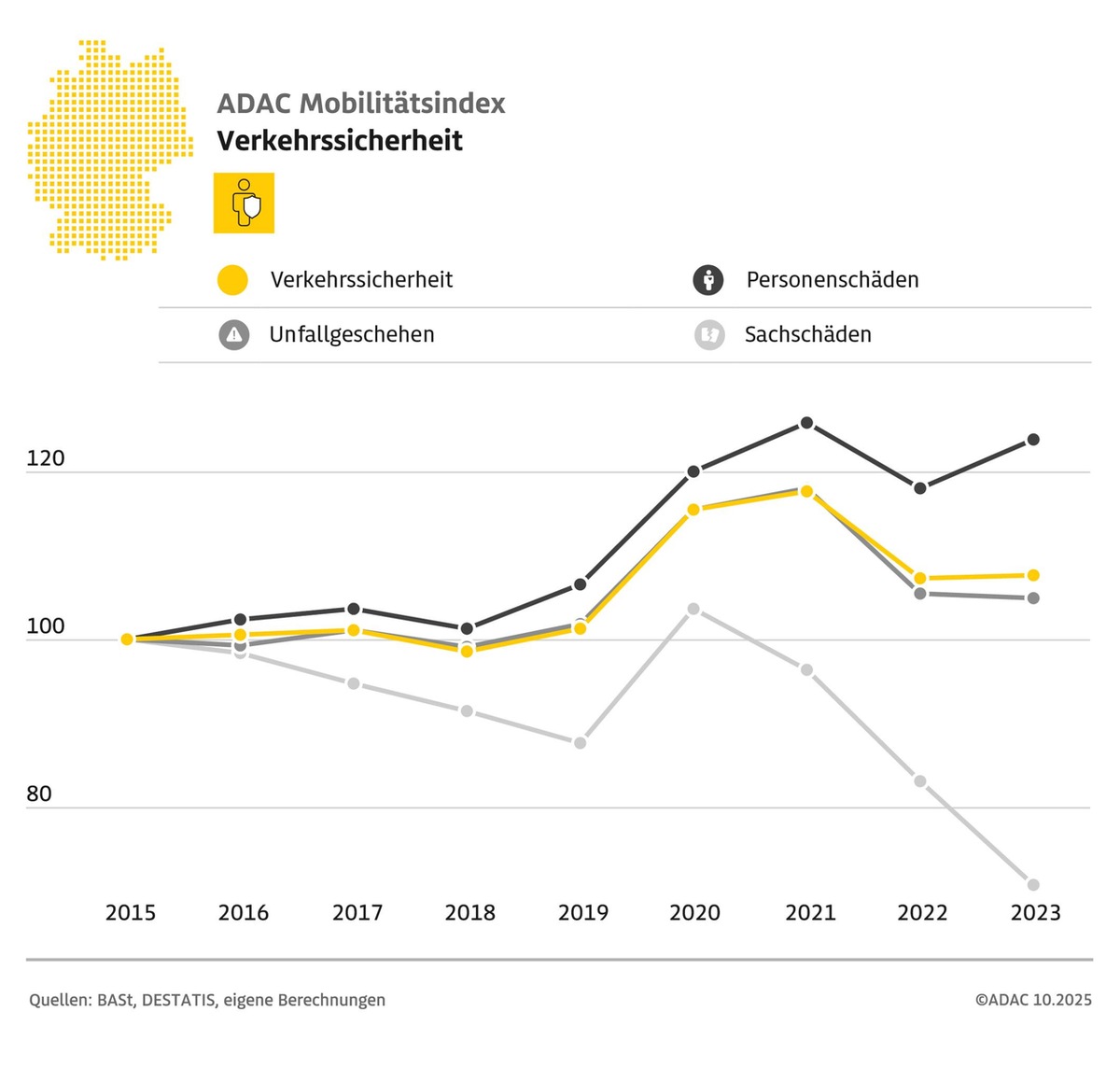 In der Bewertungsdimension "Verkehrssicherheit" gab es nur leichte Fortschritte - hier verzeichnete der ADAC eine Verbesserung um einen Punkt auf 108. Für die Verbesserung sorgt, dass die Zahl der Schwerverletzten sowie der Verkehrstoten seit 2015 zurückgeht. Auf der anderen Seite hat die Zahl der Unfälle mit Personenschaden zugenommen. Unfälle sind also zwar häufiger geworden, haben für die Pkw-Insassen jedoch weniger schwere Folgen. Aus Sicht des ADAC zeigt dies, dass die Fortschritte im Bereich der Fahrzeugsicherheit wirken. Neue Risiken mit negativen Folgen zeigen sich jedoch im Fahrradverkehr. Die hohe Zahl der Personenschäden in Relation zur Verkehrsleistung macht deutlich, dass die Verkehrssicherheitsarbeit hier vor neuen Herausforderungen steht. Ein wachsendes Problem ist der hohe Anteil von Alleinunfällen mit Zweirädern, der aufgrund der gestiegenen Nutzung von Pedelecs zuletzt zugenommen hat.