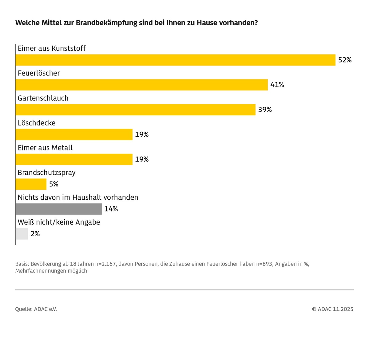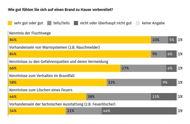Umso alarmierender ist das Ergebnis einer ADAC Umfrage zum Thema Wohnungsbrand. Denn danach fühlen sich nur 30 Prozent der Befragten gut oder sehr gut auf einen Wohnungsbrand vorbereitet und wüssten, was zu tun wäre. Zudem haben 59 Prozent der Bevölkerung keinen Feuerlöscher zuhause, bei Löschdecke und Brandschutzspray sind es sogar 81 bzw. 95 Prozent.