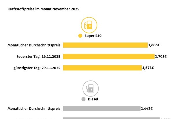 Günstigster Tag zum Tanken war bei Benzin am 29. November, als ein Liter Super E10 1,673 Euro kostete. Am teuersten war Super E10 am 16. November mit einem Tagesmittel von 1,701 Euro - die Schwankungen innerhalb des Monats waren somit insgesamt gering. Deutlich ausgeprägter waren die Preisbewegungen bei Diesel. So war der Literpreis mit 1,613 Euro am 4. November auf dem Monatstiefststand. Am 21. November erreichte der Diesel-Preis mit 1,677 Euro seinen Monatshöchststand.