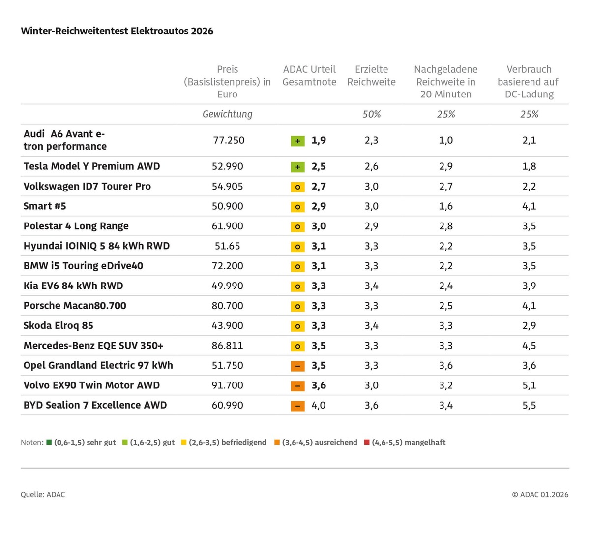 Elektromobilität kommt auf der Langstrecke voran, doch die kalte Jahreszeit bleibt eine Herausforderung. Nachdem sich im letzten Winter die jeweils reichweitenstärksten Modelle der Hersteller beweisen mussten, waren im aktuellen ADAC Test 14 familienfreundliche Elektroautos an der Reihe. Diese zeigten, dass viele Modelle auch längere Autobahnfahrten bei Kälte inzwischen gut meistern, allerdings mit teils deutlichen Unterschieden bei Reichweite, Verbrauch und Ladegeschwindigkeit.