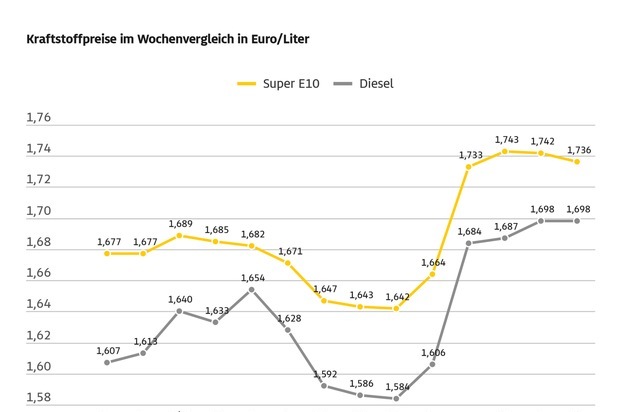 Nachdem die Kraftstoffpreise einige Wochen lang auf einem zu hohem Niveau lagen, bewegt sich nun zumindest der Benzinpreis wieder abwärts. Wie die aktuelle ADAC Auswertung der Kraftstoffpreise in Deutschland zeigt, kostet ein Liter Super E10 im bundesweiten Mittel 1,736 Euro und damit 0,6 Cent weniger als vor einer Woche. Diesel kostet wie bereits in der Vorwoche im Schnitt 1,698 Euro.