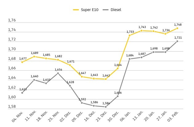 Etwa auf dem Niveau der Vorwoche stehen die Rohölnotierungen: Für ein Barrel (159 Liter) Rohöl der Sorte Brent müssen zurzeit rund 67 US-Dollar bezahlt werden und damit etwa ein Dollar weniger als vor einer Woche. Allerdings hat der Euro im Vergleich zum US-Dollar wieder etwas an Stärke eingebüßt. Aus Sicht des ADAC ist der Benzinpreis damit auf einem noch vertretbaren Niveau, nicht jedoch der Dieselpreis. Angesichts der sehr geringen Differenz in Höhe von 2,7 Cent zum Preis von Super E10 sieht der ADAC Luft für Preisnachlässe bei Diesel trotz saisonaler Effekte wie z.B. der Heizölnachfrage aufgrund der kalten Witterung. Zur Erinnerung: Auf einen Liter Diesel sind rund 20 Cent weniger Energiesteuer zu bezahlen - von diesem Unterschied sind die aktuellen Kraftstoffpreise weit entfernt.