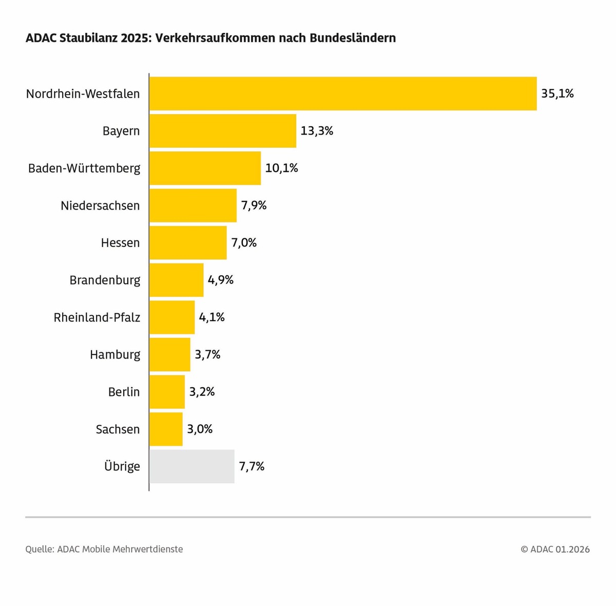 Bundesweit entfielen die meisten Staustunden auf Nordrhein-Westfalen mit 35 Prozent, gefolgt von Bayern mit 13 Prozent und Baden-Württemberg mit 10 Prozent. Die höchsten prozentualen Zuwächse wurden in Hamburg und Schleswig-Holstein (jeweils rund 30 Prozent mehr als 2024) sowie in Rheinland-Pfalz (plus 19 Prozent) verzeichnet.
