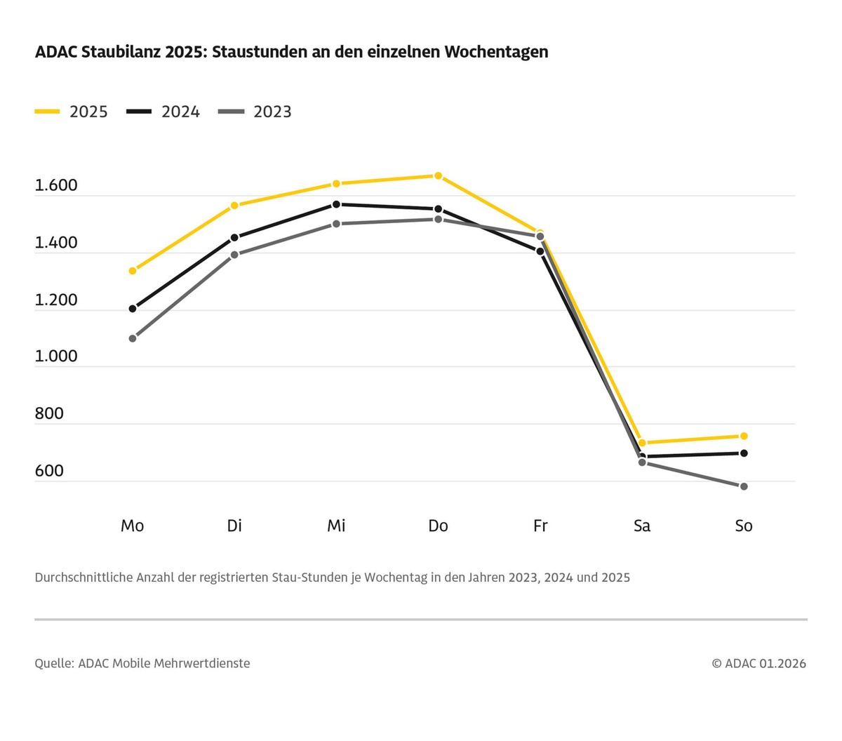 Der ADAC erwartet für das Jahr 2026 eine moderate Zunahme des Verkehrsaufkommens, die voraussichtlich auch zu mehr Staus führen wird. Auch die dringend erforderlichen umfangreichen Baumaßnahmen zur Modernisierung hunderter maroder Autobahnbrücken werden zusätzlich (Verkehrs-)Behinderungen verursachen. Gleichzeitig sind sie jedoch alternativlos, um das Autobahnnetz zukunftsfit zu machen.