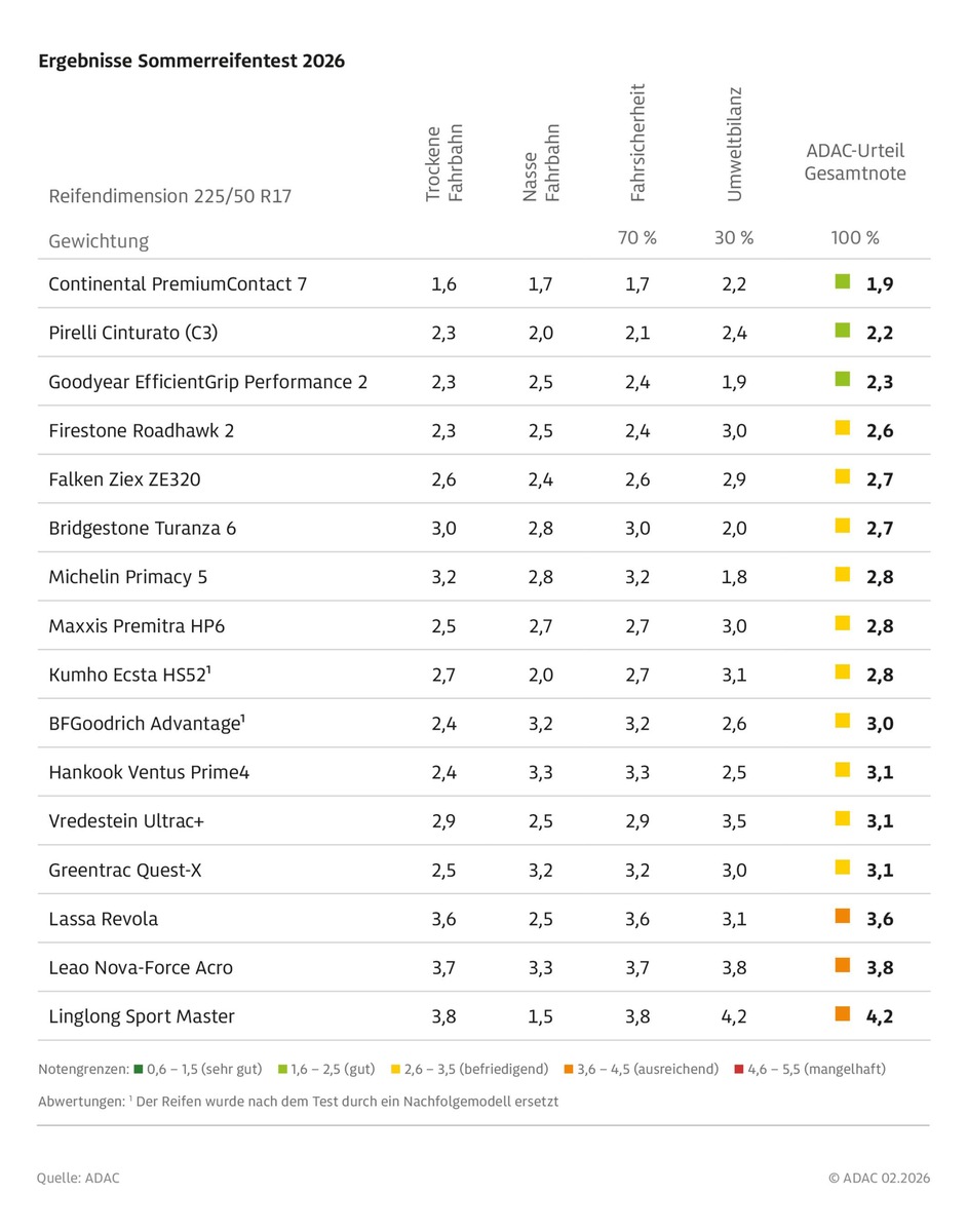 In der aktuellen Testrunde können sich drei Modelle eine gute Gesamtbewertung sichern: Der Continental PremiumContact 7 erreicht mit dem Gesamturteil 1,9 die Spitze des Klassements. Er hat zudem mit deutlichem Abstand die beste Bewertung in der Fahrsicherheit, wobei er sowohl auf trockener als auch nasser Fahrbahn nur knapp an einer sehr guten Bewertung vorbeischrammt. Dem Conti folgen der Pirelli Cinturato C3 (Gesamturteil 2,2) und der Goodyear EfficientGrip Performance 2 (Gesamturteil 2,3). Auf dem vierten Platz landet mit dem Firestone Roadhawk 2 (Gesamturteil 2,6) ein Reifen, der eigentlich gute Fahrleistungen aufweist. Die Umweltbilanz (Urteil 3,0) ist allerdings nur zufriedenstellend und kostet eine gute Gesamtbewertung.