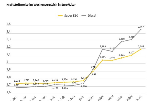 Wie die ADAC Auswertung zeigt, kostet Super E10 derzeit 2,188 Euro, vor einer Woche lag der Preis noch bei 2,107 Euro. Für Diesel müssen die Autofahrerinnen und Autofahrer aktuell 2,447 Euro (Vorwoche: 2,316 Euro) bezahlen, so viel wie noch nie. Das bisherige Allzeithoch nach Beginn des Ukraine-Kriegs wurde mit Einführung des Österreich-Modells überschritten und im Laufe der vergangenen Woche an jedem Tag ein Stück weiter nach oben geschraubt. Das zeigt auch, dass das Österreich-Modell dazu geführt hat, dass die Dieselpreise jeden Tag um 12 Uhr mittags stärker gestiegen sind, als sie in den darauffolgenden 24 Stunden wieder gesunken sind. Auch der Preis von Super E10 hat fast an allen Tagen im Vergleich zum Vortag spürbar zugelegt.