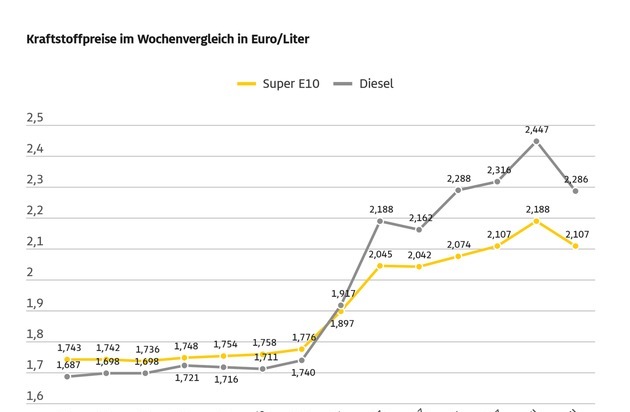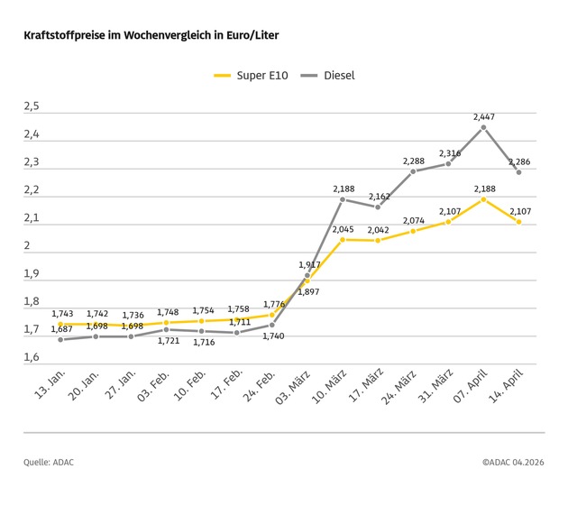 Leichte Entspannung am Kraftstoffmarkt, aber noch lange keine Entwarnung - so könnte man die Entwicklung der Kraftstoffpreise während der vergangenen Woche bewerten. Wie die aktuelle ADAC Auswertung der Kraftstoffpreise in Deutschland zeigt, ist vor allem der Dieselpreis sehr deutlich gesunken: Danach kostet ein Liter des Kraftstoffs im bundesweiten Durchschnitt derzeit 2,286 Euro, das sind 16,1 Cent weniger als vor einer Woche. Nur etwa halb so stark ist Benzin billiger geworden: Für einen Liter Super E10 müssen die Autofahrerinnen und Autofahrer im Mittel 2,107 Euro je Liter bezahlen - ein Minus von 8,1 Cent. Der Rohölpreis als maßgebliche Größe zur Bewertung der Kraftstoffpreise rangiert wie in der Vorwoche bei etwa 95 US-Dollar. Damals wurde der zweiwöchige Waffenstillstand zwischen den USA und Iran verkündet. Als Folge war der Ölpreis im Tagesverlauf um bis zu 15 Prozent abgestürzt und schloss auf einem ähnlichen Niveau wie derzeit. Erst mit Verzögerung kam dies auch bei den Preisen an den Zapfsäulen an.