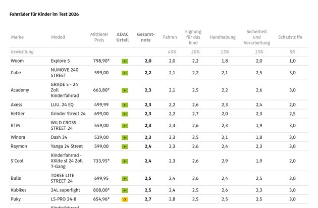 Grundsätzlich finden sich unter den Rädern im Test viele gute Optionen, ein genauer Blick auf Sicherheitsdetails, Ausstattung und mögliche Schadstoffbelastungen einzelner Bauteile bleibt jedoch unerlässlich. Das Woom Explore 5 stach mit besonders guten Leistungen heraus, denn es erreichte in allen Kategorien die Bestnoten und wird mit der ADAC Gesamtnote 2,0 der klare Testsieger. Das Woom ist das einzige Modell im Test, das mit Scheibenbremsen ausgestattet ist. Diese zeigten besonders bei nassen Bedingungen konstante Bremsleistungen. Auf dem zweiten Rang im Test landet das Cube Numove 240 Street (Gesamtnote 2,2).
