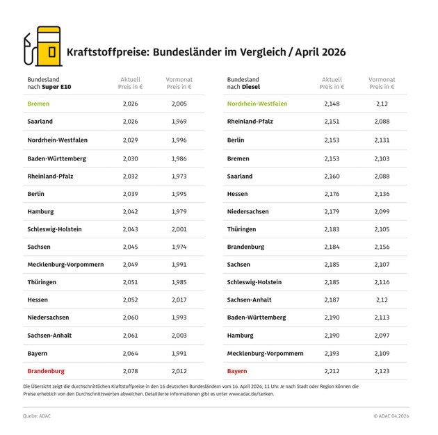 Für die heutige Untersuchung hat der ADAC die Preisdaten von mehr als 14.000 bei der Markttransparenzstelle für Kraftstoffe erfassten Tankstellen ausgewertet und den 16 Bundesländern zugeordnet. Die ermittelten Preise stellen eine Momentaufnahme vom 16. April 2026 (11 Uhr) dar.