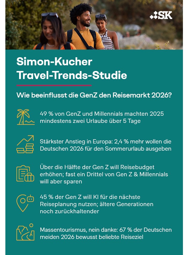 Die Gen Z hat den Reisemarkt laut der Simon-Kucher Travel-Trends-Studie fest im Griff. So machte die Hälfte 2025 nicht nur zwei Reisen über 5 Tage - die Mehrheit der jungen Menschen will ihr Reisebudget für 2026 sogar weiter erhöhen. Der Effekt dieses Trends? Deutschland verzeichnet in Europa den größten Anstieg bei geplanten Reiseausgaben. Auch bei der Reiseplanung mit KI hat die Gen Z die Nase vorn. Trotzdem suchen die meisten nach besonderen Destinationen: Zwei von drei Deutschen wollen beliebte Reiseziele meiden, um Massentourismus und hohen Preisen zu entgehen.