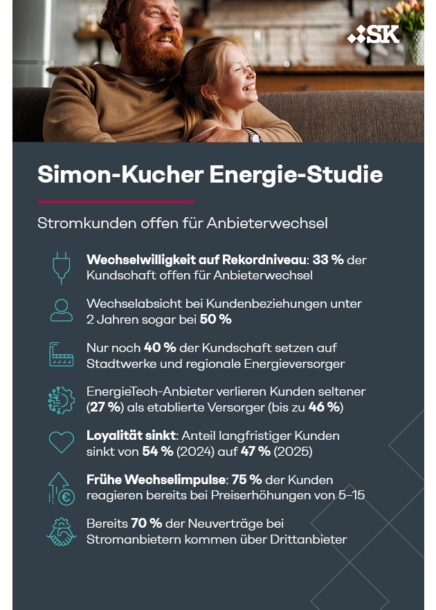 - Wechselwilligkeit auf Rekordniveau: 33 % der Kundschaft offen für Anbieterwechsel
