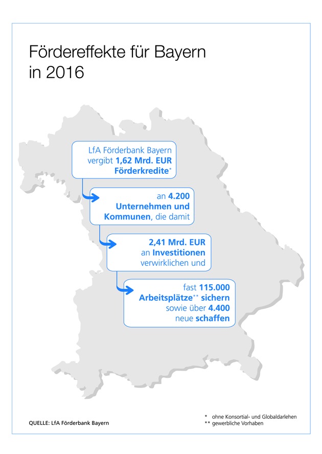 Bayerns Wirtschaftsministerin und LfA-Verwaltungsratsvorsitzende Ilse Aigner erklärt: "Die Förderleistung der LfA für die bayerische Wirtschaft ist beeindruckend: Im Jahr 2016 konnten allein mit den Förderkrediten über 4.000 Gründer und mittelständische Betriebe unterstützt werden. Mit den Fördermitteln wurden Investitionen in Höhe von gut 2,1 Milliarden Euro angestoßen. Das stärkt die internationale Wettbewerbsfähigkeit der Betriebe und schafft Wachstum und Arbeitsplätze in Bayern. So konnten mit Hilfe der LfA fast 115.000 Stellen gesichert und über 4.400 neue Arbeitsplätze geschaffen werden."