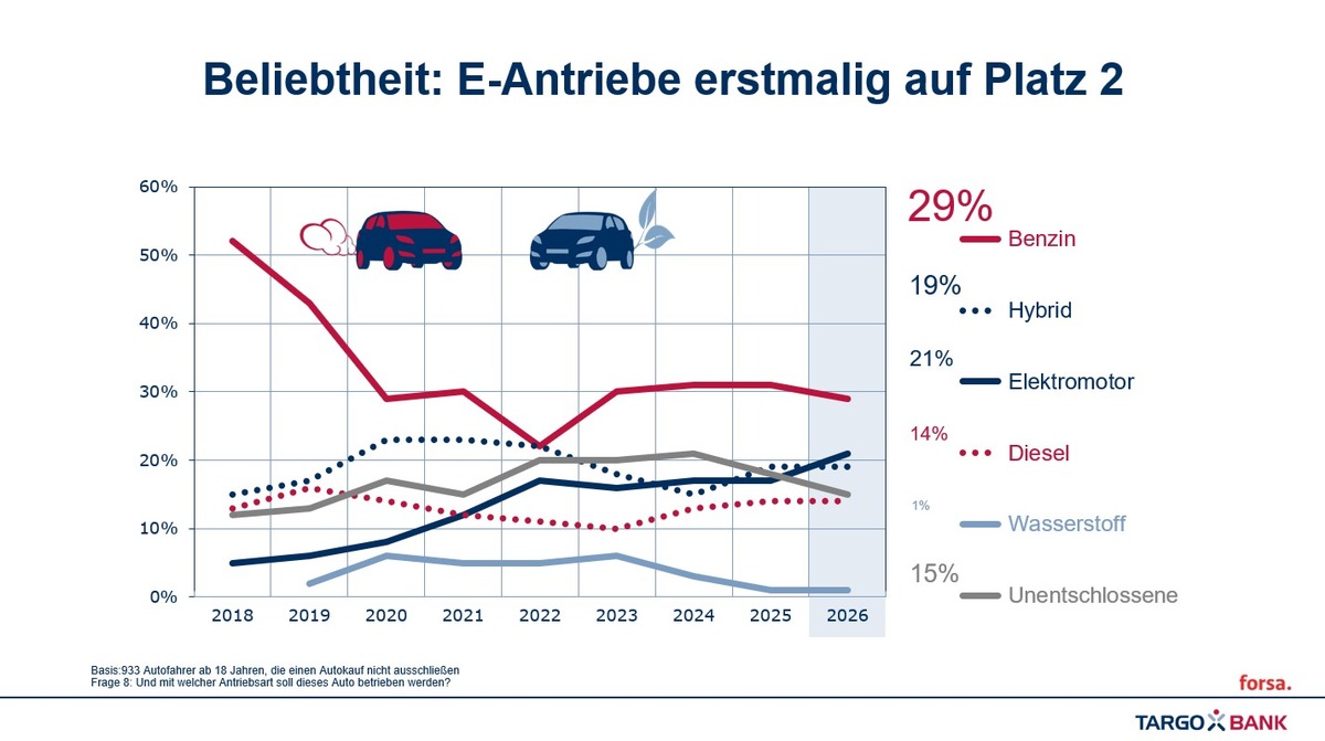 Die wichtigsten Entscheidungsfaktoren für die Wahl der Antriebsart sind wie im Vorjahr die Anschaffungskosten des Autos (31 Prozent) und die Reichweite (30 Prozent), auch Kraftstoffpreise werden wieder wichtiger (15 Prozent, 2025: 13 Prozent). Auf die Frage, wie sie planen, ihr neues Fahrzeug zu bezahlen, nennt gut die Hälfte (53 Prozent) Barmittel (2025: 53 Prozent), gut ein Drittel (36 Prozent) setzt auf Finanzierungen bzw. Leasing (2025: 37 Prozent).