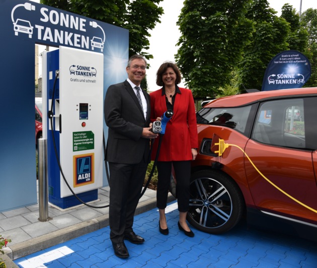 Mobil unterwegs mit kostenfreiem Sonnenstrom - für die Kunden der Münchener ALDI SÜD Filiale an der Georg-Reismüller-Straße 16 im Stadtteil Allach ist das ab sofort möglich. Deutschlands führender Discounter hat den Kundenparkplatz mit Schnellladesäulen ausgestattet, an denen die Kunden während des Einkaufs ihr Elektrofahrzeug kostenfrei nachladen können. Diesem ersten Ladepunkt in Bayern werden noch vier weitere in der Landeshauptstadt und sechs weitere im Bundesland folgen. Deutschlandweit installiert ALDI SÜD an rund 50 seiner Standorte Schnellladesäulen.