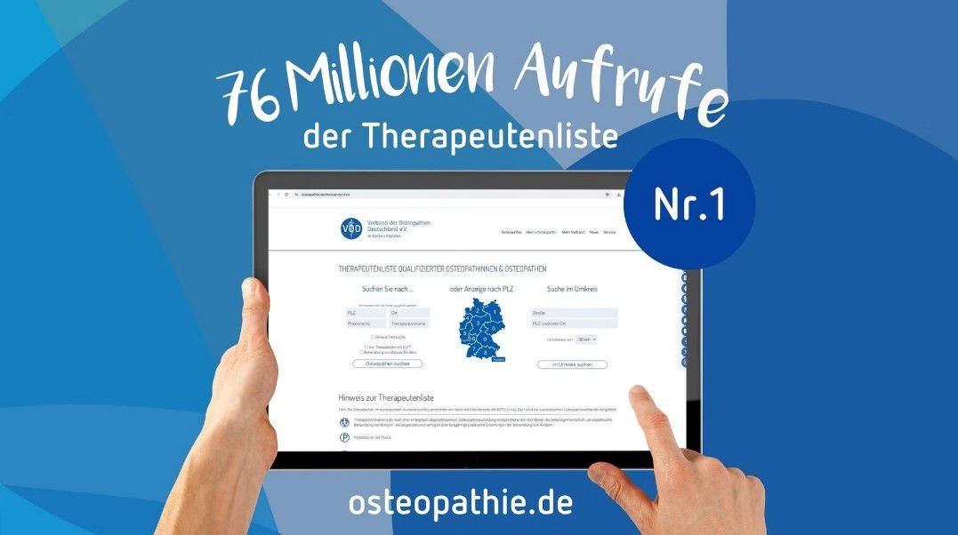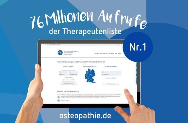 Besonders beliebt ist die größte Osteopathen-Suche Deutschlands. Seit ihrem Start im Jahr 2007 wurde sie mehr als 76 Millionen Mal genutzt. Mit wenigen Klicks finden Patientinnen und Patienten hier qualifizierte Osteopathinnen und Osteopathen - übersichtlich sortiert nach Wohnort, Postleitzahl oder Praxisnamen. So wird die Suche nach einer passenden Behandlung einfach und transparent (osteopathie.de/therapeutenliste).