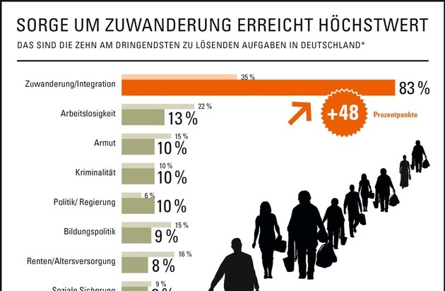 Das Thema Zuwanderung bewegt die Deutschen wie kein anderes: Etwa vier von fünf Bundesbürgern (83 Prozent) halten Zuwanderung und Integration für eine der am dringendsten zu lösenden Aufgaben im Land. Im Vergleich zum Vorjahr hat sich diese Besorgnis mehr als verdoppelt. Dafür sinkt die Sorge um Arbeitslosigkeit in Deutschland weiterhin. Dies zeigt die Studie "Challenges of Nations 2016" des GfK Vereins. Befragt wurden mehr als 27.600 Menschen in 24 Ländern. Über alle Nationen hinweg betrachtet dominieren Inflation und Arbeitslosigkeit das Sorgenranking.