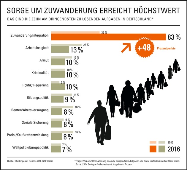 Das Thema Zuwanderung bewegt die Deutschen wie kein anderes: Etwa vier von fünf Bundesbürgern (83 Prozent) halten Zuwanderung und Integration für eine der am dringendsten zu lösenden Aufgaben im Land. Im Vergleich zum Vorjahr hat sich diese Besorgnis mehr als verdoppelt. Dafür sinkt die Sorge um Arbeitslosigkeit in Deutschland weiterhin. Dies zeigt die Studie "Challenges of Nations 2016" des GfK Vereins. Befragt wurden mehr als 27.600 Menschen in 24 Ländern. Über alle Nationen hinweg betrachtet dominieren Inflation und Arbeitslosigkeit das Sorgenranking.