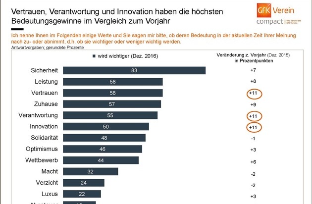 Der GfK Verein befragte in der ersten Dezemberhälfte 2016 rund 2.000 Menschen zu insgesamt 13 Wertebegriffen und deren künftiger Relevanz. Wie die Ergebnisse zeigen, sind die Meldungen in den Medien zu Terror, Krisen und Konflikte an den Menschen in Deutschland nicht spurlos vorübergegangen. Der Wert "Sicherheit" legte noch einmal deutlich zu und liegt mit 83 Prozent erneut auf dem ersten Platz des Werterankings - eine Steigerung um sieben Prozentpunkte. Im vergangenen Jahr lag er noch bei 76 Prozent, vor 5 Jahren waren sogar nur 68 Prozent der Deutschen der Ansicht, dass Sicherheit ein Thema mit steigender Relevanz ist. Lediglich zwei Prozent glauben derzeit, dass dieser Wert in Zukunft an Bedeutung verliert.