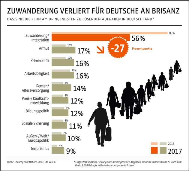"Zuwanderung und Integration" bleibt auch 2017 das Topthema der deutschen Sorgenagenda. Im Vergleich zu 2016 verliert die Thematik aber mit einem Rückgang um 27 Prozentpunkte deutlich an Brisanz. Im Gegenzug werden andere Herausforderungen wie Armut, Renten und Kriminalität wieder dringlicher. Die langjährige Hauptsorge Arbeitslosigkeit bleibt unter den Top 5, stabilisiert sich aber auf einem historisch niedrigen Niveau. Dies zeigt die Studie "Challenges of Nations 2017", für die mehr als 27.500 Menschen in 24 Ländern nach den dringendsten Herausforderungen in ihrem Land befragt wurden. Über alle Nationen hinweg betrachtet dominiert das Thema Arbeitslosigkeit das Sorgenranking.