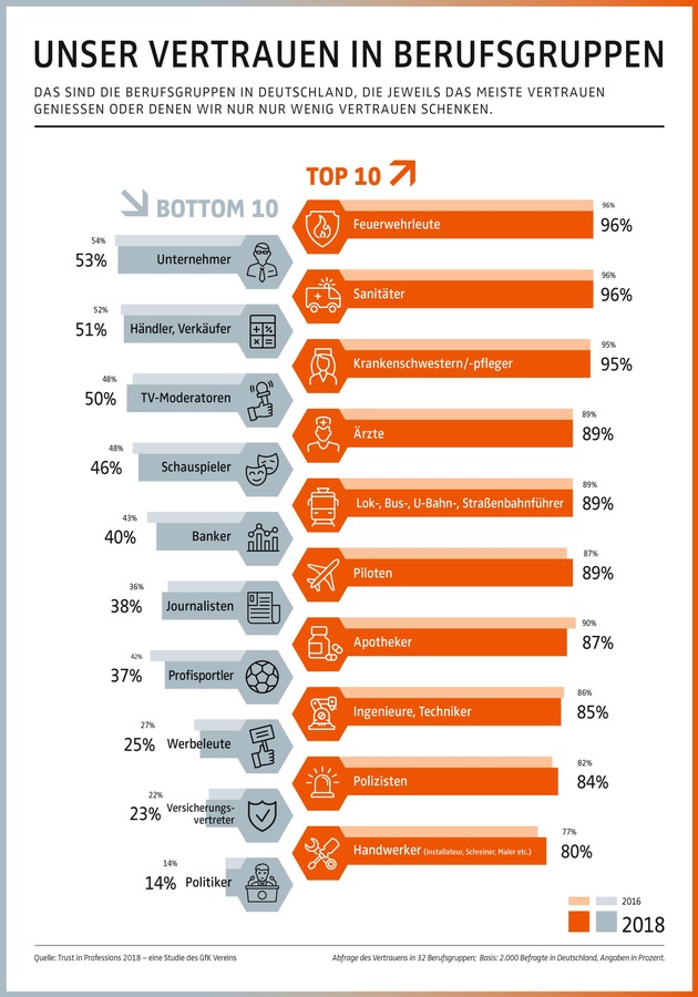 DEUTSCHLAND: Vertrauen* in Berufsgruppen Deutschland Top 10 in Prozent 2016 2018 Feuerwehrleute 96 96 Sanitäter 96 96 Krankenschwestern/-pfleger 95 95 Ärzte 89 89 Lok-, Bus-, U-Bahn-, Straßenbahnführer 89 89 Piloten 87 89 Apotheker 90 87 Ingenieure, Techniker 86 85 Polizisten 82 84 Handwerker (Installateur, Schreiner, Maler etc.) 77 80