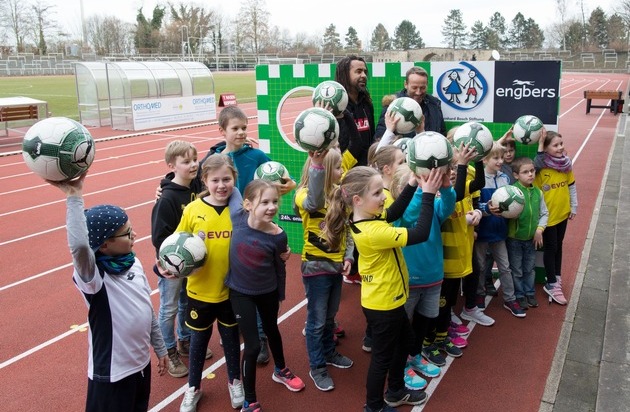 engbers: Wotan Wilke Möhring und Patrick Owomoyela kicken mit Zweitklässlern für den guten Zweck