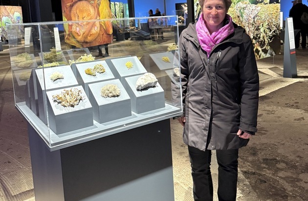 In der neuen Ausstellung „Mythos Wald“, die noch bis 30. Dezember 2026 im Gasometer in Oberhausen zu sehen ist, können Besucher*innen eine Vitrine mit sechs Flechten und sechs Moosarten, die Dr. Dorothee Killmann von der Universität Koblenz gesammelt und in Szene gesetzt hat, bewundern.
