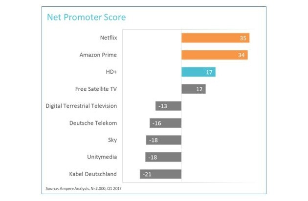 Net Promoter Score von Ampere Analysis zeigt: HD+ und Astra liegen hinsichtlich Weiterempfehlung deutlich vor Kabel und IPTV // Unter allen abgefragten TV-Angeboten in Deutschland liegt HD+ in puncto Weiterempfehlung auf Platz drei // Free-TV über Astra Satellit einzige TV-Infrastruktur mit positiver Weiterempfehlungsquote