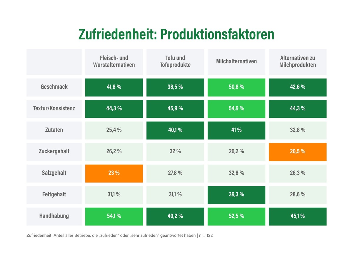 Geschmack, Textur und Handhabung erzielen derweil hohe Zufriedenheitswerte. Besonders Milchalternativen überzeugen bei diesen Produktionsfaktoren mehr als die Hälfte der befragten Betriebe. Ernährungsphysiologische Aspekte und lange Zutatenlisten treffen indessen auf Kritik. Mit dem Salzgehalt von Fleisch- und Wurstalternativen ist nicht einmal ein Viertel der Unternehmen zufrieden, obgleich er dem von tierischen Pendants ähnelt. Den Zuckergehalt von Alternativen zu Milchprodukten beurteilt eines von fünf Unternehmen kritisch. Gesundheitliche Vorteile geraten dagegen oft ins Hintertreffen.