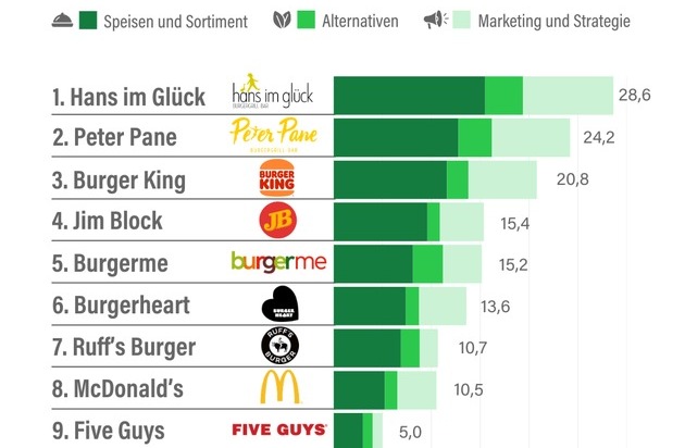 Für das diesjährige ProVeg-Ranking analysierte die Ernährungsorganisation im Januar die digitalen Speisekarten und Sortimentsübersichten der Top-100-Unternehmen der deutschen Markengastronomie. Dabei wertete ProVeg die pflanzlichen Angebote erstmals getrennt nach den Kernsegmenten Burger, Pizza & Pasta und Bakery aus. Die Auswertung erfolgte quantitativ und qualitativ auf einer stufenlosen Skala. Neben der Vielfalt der angebotenen Menübestandteile und Alternativen zu Fleisch, Käse und Milch untersuchte ProVeg außerdem strategische Faktoren wie Preisgestaltung, Kennzeichnung und Nudging.