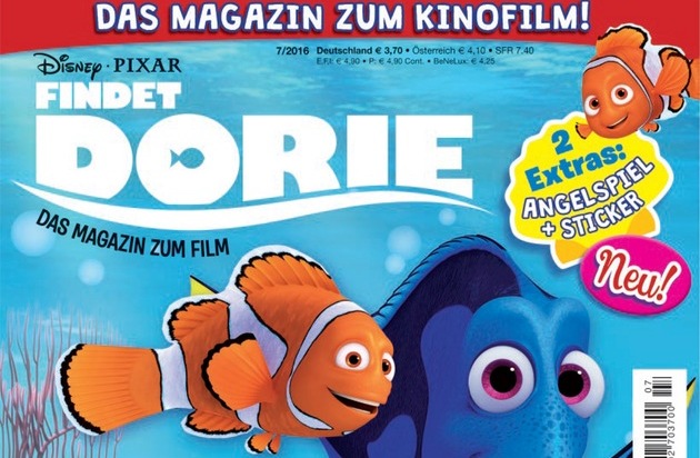 Einfach schwimmen, einfach schwimmen, schwimmen, schwimmen, schwimmen! Die süße und etwas zerstreute Dorie schwimmt wieder auf der großen Leinwand und macht sich auf die Suche nach ihrer Familie. Ehapa unterstützt ihre Suche mit dem offiziellen Magazin zum Kinoerfolg, das zeitgleich zum Start am 29.09. erscheint. Gemeinsam mit dem beliebten Clownfisch Nemo taucht Ehapa in die farbenprächtige Unterwasserwelt und bietet Spannung, Spaß und Abenteuer für Kinder im Vorschulalter. In süßen Geschichten und kunterbunten Comics geht es vor allem um die Themen Familie, Freundschaft und Abenteuer. Zudem bietet das Magazin zahlreiche knifflige Rätsel, lustige Activity- und fantastische Malseiten. Das Heft erscheint mit einem tollen 3D-Extra, das direkt aus dem Ozean von Dorie und Nemo kommt.
