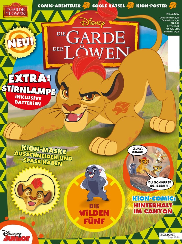Mit Disney Die Garde der Löwen veröffentlicht Egmont Ehapa am 29.03. das offizielle Magazin zur erfolgreichen Disney Junior TV-Serie. Basierend auf dem Animations-Kinohit Disney König der Löwen wird die Erfolgsgeschichte um die mutigen Löwen weitererzählt. Löwenjunge Kion muss gemeinsam mit seinen mutigen Freunden spannende Herausforderungen bestehen. Neben der TV-Serie wird die Handlung in aufregenden Geschichten und starken Comics im offiziellen Magazin weitererzählt. Gerade für Vorschulkinder bietet das Magazin spannende Rätsel, lustige Activity-Seiten und ein tolles 3D-Extra, das direkt aus Kions Abenteuerwelt kommt. Mit Mut, Freundschaft und Abenteuerlust - auf ins Magazin mit Gebrüll!