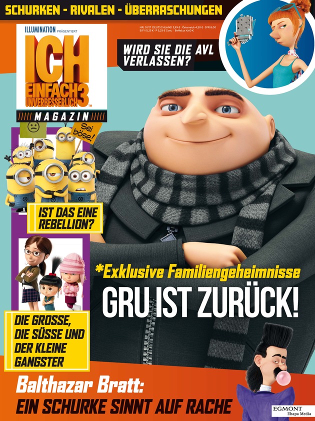In "Ich - Einfach unverbesserlich 3" hat Gru dem Leben als Superschurken abgeschworen - sehr zum Leidwesen seiner gelben Helfer. Der Entschluss sorgt für eine Minions-Rebellion. Doch auch das bekannte, fluffig-flauschige Einhorn spielt diesmal eine große Rolle! Das neue Magazin erscheint 2017 zwei Mal und richtet sich an Jungs und Mädchen zwischen sechs und zwölf Jahren sowie ältere Fans der coolen, gelben Minions. Neben dem Magazin erscheinen bei Egmont Balloon zudem spannende Wimmel-, Bilder- sowie Mal- und Rätsel-Bücher und auch das offizielle Buch zum Kinofilm. Das Magazin und die Bücher sind im Handel und auch im Ehapa-SHOP erhältlich: https://www.egmont-shop.de/ich-einfach-unverbesserlich
