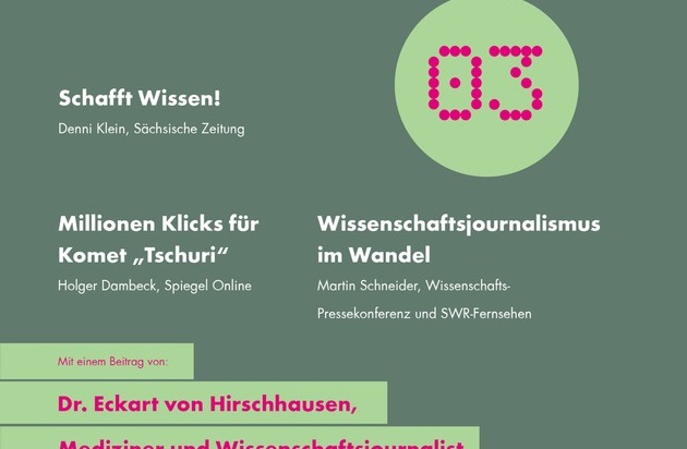 Mit gut gemachter Wissenschaftsberichterstattung können Medien ihr Publikum begeistern und an sich binden. Denn Leser, Hörer und Zuschauer suchen in den Wissensteilen von Zeitungen, Onlineseiten, Hörfunk- und Fernsehprogrammen nach Orientierung in einer immer komplexer werdenden Welt - und nutzen die oft multimedialen Inhalte mit großem Interesse. Erfolgsgeschichten auf dem weiten Feld des Wissenschaftsjournalismus' sowie Ideen für seine Weiterentwicklung hat jetzt die Nachrichtenagentur dpa in einem kostenlos erhältlichen Whitepaper zusammengetragen. Die Autoren sind Praktiker aus Print-, Online- und elektronischen Medien, darunter der Mediziner, Moderator und Autor Dr. Eckart von Hirschhausen, der "Fünf steile Thesen zur Zukunft des Wissenschaftsjournalismus" vorstellt.