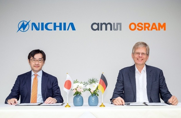 Nichia und ams OSRAM weiten ihre langjährige Zusammenarbeit im Bereich des geistigen Eigentums (IP) aus. Hiroyoshi Ogawa, Präsident und CEO der Nichia Corporation, und Aldo Kamper, CEO der ams-OSRAM AG, unterzeichneten eine umfassende Kreuzlizenzvereinbarung, die Tausende patentgeschützter Innovationen im Bereich der LED- und Lasertechnologie umfasst.