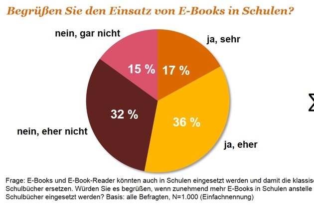 Besonders jüngere Befragte befürworteten die Einführung von E-Books an den Schulen. So lag die Zustimmung unter den 18- bis 29-Jährigen bei 62 Prozent, unter den 30- bis 39-Jährigen sogar bei 65 Prozent. Deutlich skeptischer waren die Älteren. Unter den Über-60-Jährigen zeigten sich nur 42 Prozent aufgeschlossen für das Thema. Als wichtigste Argumente, die für elektronische Schulbücher sprechen, wurden "weniger Gewicht" (60 %) und "geringerer Platzbedarf" (58 %) genannt. Jeder zweite Befragte sieht zudem in der Möglichkeit, den Inhalt ständig zu aktualisieren, einen großen Vorteil. Als mögliche Nachteile wurde gesagt, dass Kinder ohnehin schon "genug vor dem Computer, Fernseher usw. sitzen" (56 Prozent). Fast ebenso viele Befragte (54 %) gaben zu bedenken, mit E-Books hänge der Lernerfolg stark davon ab, dass die Technik auch tatsächliche funktioniere.