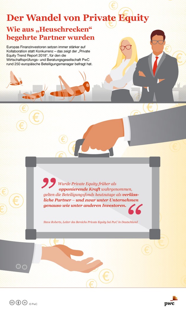 "Die Umfrageergebnisse zeigen, wie grundlegend sich die Rolle der Finanzinvestoren im europäischen Wirtschaftsleben gewandelt hat", sagt PwC-Partner Roberts. "Wurde Private Equity früher als opponierende Kraft wahrgenommen, gelten die Beteiligungsfonds heutzutage als verlässliche Partner - und zwar unter Unternehmen genauso wie unter anderen Investoren. "Dies zeigt auch ein weiteres Ergebnis des "Private Equity Trend Reports 2018". So meinten 37 Prozent der PE-Manager auf die Frage, was sich denn im Verhältnis zu den eigenen Geldgebern verändere, dass diese sich immer offener für gemeinsame Investitionsprojekte zeigten. "Auch das ist ein bemerkenswerter Wandel", sagt Roberts: "Es gab mal eine Zeit, da versteckten sich Pensionskassen oder Versicherer hinter Private Equity. Dagegen treten sie inzwischen offensiv als Co-Investoren in die Öffentlichkeit."