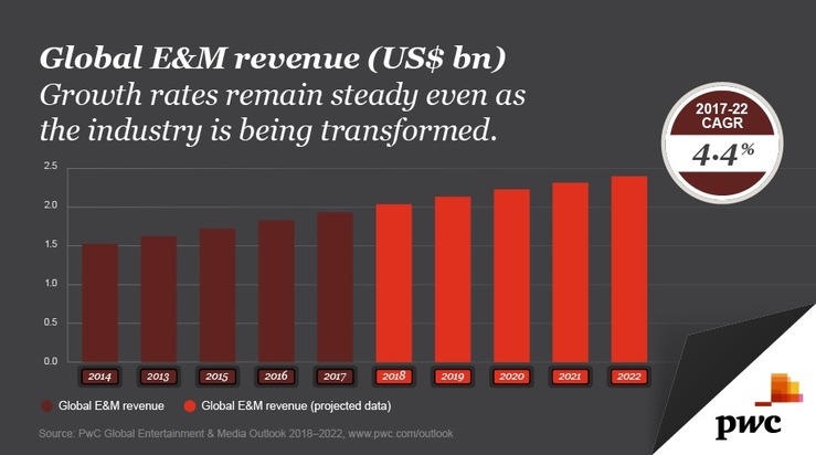 Der Global Entertainment & Media Outlook von PwC erscheint seit 2003 und bietet ein umfassendes Bild über die weltweite Unterhaltungs- und Medienbranche und die Entwicklungen der fünfzehn Segmente Buchmarkt, Business-to-Business, Kinomarkt, Datenkonsum, Internetzugang, Onlinewerbung, Zeitschriftenmarkt, Musik-, Radio- und Podcast-Mark, Zeitungsmarkt, OTT-Videomarkt, Außenwerbung, Fernsehmarkt und Heimkino-Markt, TV-Werbung, Videospiele und eSport sowie Virtual Reality.