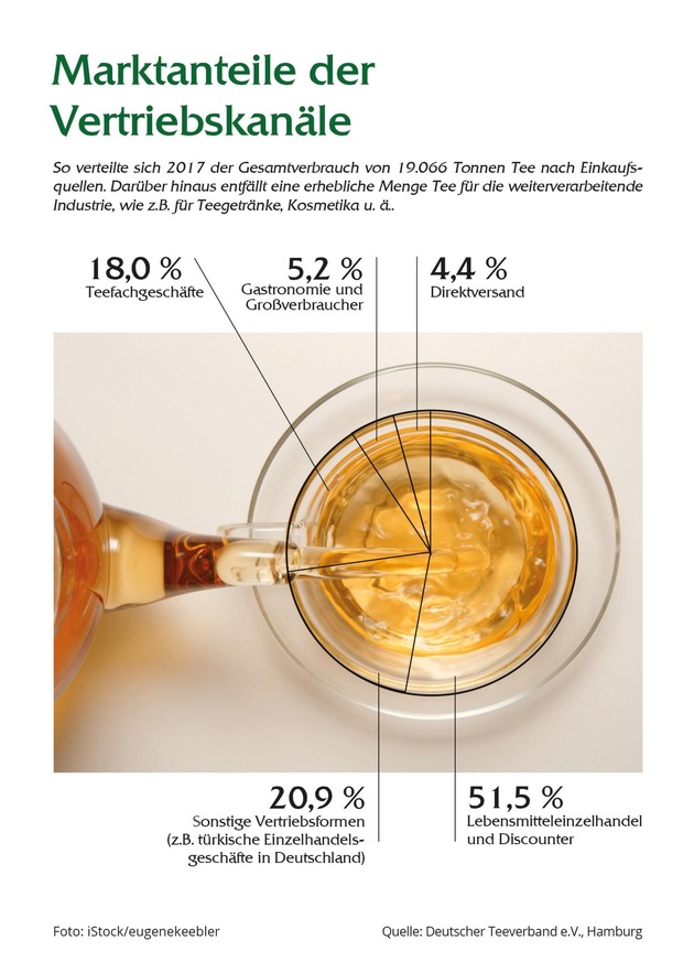 Die meisten Deutschen kaufen ihren Tee im Lebensmitteleinzelhandel oder beim Discounter: Mit 51,5 Prozent ist dies weiterhin der stärkste Vertriebsweg. 18 Prozent besuchen ein Teefachgeschäft. 5,2 Prozent des Tees in Deutschland wird über Großverbraucher und die Gastronomie vertrieben.