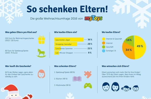 Eltern planen in diesem Jahr im Durchschnitt 150 Euro pro Kind für Weihnachtsgeschenke auszugeben - 20 Euro mehr als im Vorjahr. Davon werden erneut mehr als die Hälfte (82 Euro) in Spielzeug und Spiele investiert. Zum Vergleich: 2015 waren es 75 Euro. Zu den beliebtesten Geschenken von Eltern für Kinder zählen neben Spielzeug und Gesellschaftsspielen (80%) immer noch Bücher (48%). Nur 38% der Eltern planen, Multimedia-Produkte zu verschenken. Das ergab eine repräsentative Umfrage der rc - research & consulting GmbH im Auftrag von myToys, dem Nr. 1 Online-Shop für Spielzeug und Produkte rund ums Kind in Deutschland.
