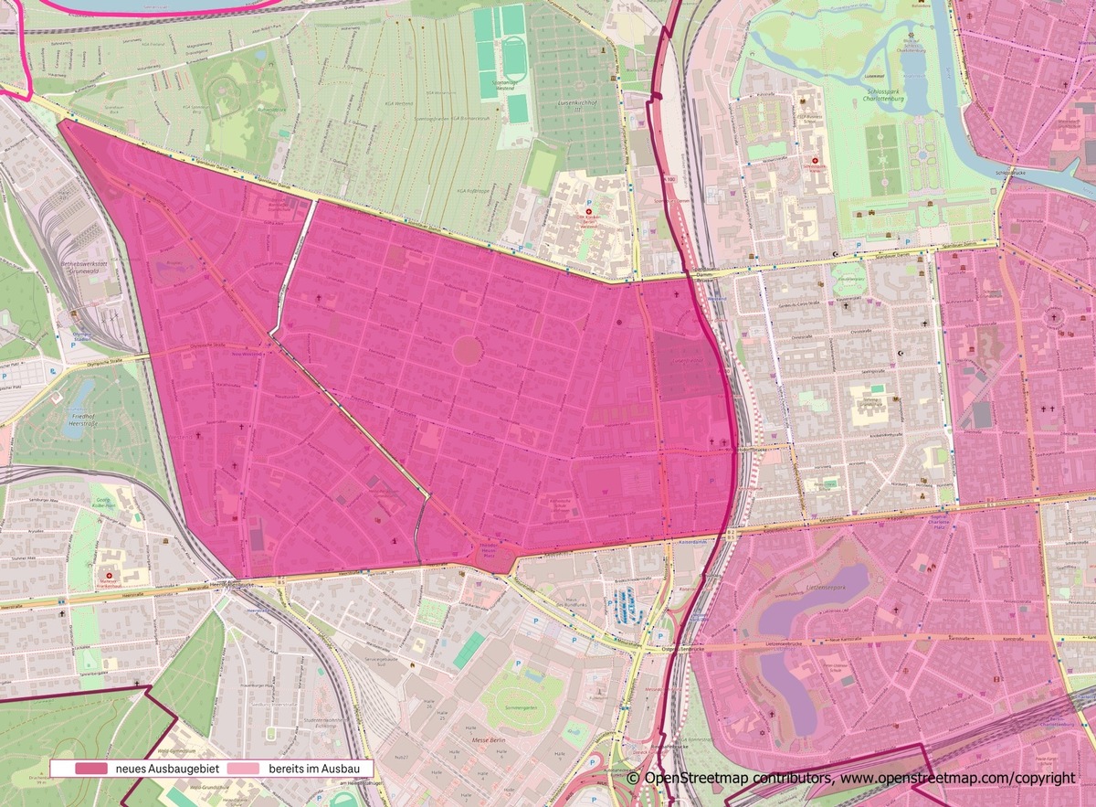 Die Telekom setzt weiterhin auf eine nachhaltige und flächendeckende Glasfaserinfrastruktur in der Hauptstadt und hat das Ziel, bis 2030 zwei Millionen Haushalte in Berlin anzuschließen. Aktuell kündigt die Telekom den Glasfaser-Ausbau für ein neues Ausbaugebiet im Ortsteil Westend rund um die Reichsstraße an. Die Baumaßnahmen hierzu werden in Kürze beginnen. Ab sofort können Sie bereits Anschlüsse buchen unter www.telekom.de/berlin.