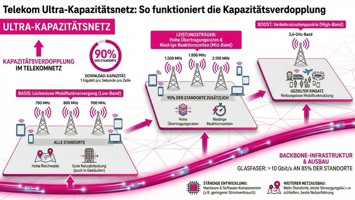 Die Telekom baut ein Ultra-Kapazitätsnetz. Durch eine Kombination von Maßnahmen wird sich die Kapazität im Telekomnetz verdoppeln. 90 Prozent der Standorte bieten künftig eine Download-Kapazität von 1 Gigabit pro Sekunde (Gbit/s) pro Zelle.