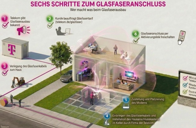 - Tarif buchen und auf den Glasfaserzug aufspringen: www.telekom.de/glasfaser