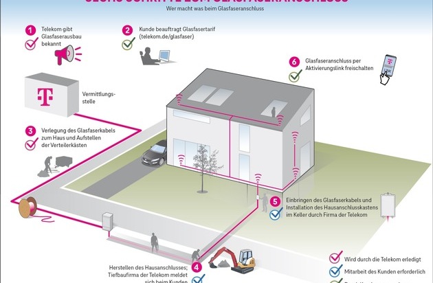 Der Glasfaseranschluss kommt nicht von allein ins Haus. Wer zur Miete wohnt, muss lediglich einen Glasfaser-Tarif buchen: www.telekom.de/glasfaser. Die Telekom kümmert sich um die Absprache mit dem Immobilienbesitzer, denn diese müssen ihre Zustimmung geben. Auch Eigentümer von Ein- oder Zweifamilienhäusern bekommen den Hausanschluss kostenfrei, wenn sie einen Tarif buchen. Mehrfamilienhäuser ab drei Wohneinheiten bekommen den Hausanschluss mit Zustimmung des Eigentümers grundsätzlich kostenlos – für die Nutzung des Internets brauchen die jeweiligen Parteien anschließend eine Tarifbuchung. Auch bei der weiteren Verlegung der Glasfaser im Zuhause unterstützt die Telekom und gewährleistet einen reibungslosen Ablauf. Die Telekom wird jetzt alle Eigentümer, Hausverwalter und Wohnungswirtschaften anschreiben und über die notwendigen Maßnahmen im Detail informieren.
