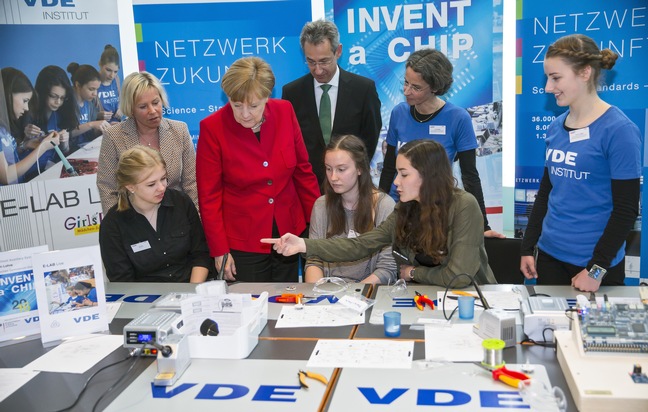 Lötkolben und Mikrochips von Schülerinnen im Bundeskanzleramt - zur Auftaktveranstaltung des bundesweiten Girls'Day bot der Technologieverband VDE mit seiner Löt- und Bastelaktion "E-LAB Live" und dem Wettbewerb "Invent a Chip" Berliner Schülerinnen spannende Technik. Der Girls'Day ist das weltweit größte Berufsorientierungsprojekt für Schülerinnen. Bundeskanzlerin Angela Merkel eröffnete heute traditionell den Aktionstag gemeinsam mit der Initiative D21 und deren Partnern wie dem VDE. Angela Merkel - selbst Diplom-Physikerin und promovierte Naturwissenschaftlerin - begrüßte die 24 Schülerinnen im Kanzleramt und erkundete mit ihnen den Technik-Parcours der ausgewählten Unternehmen und Institutionen von D21. "Wir freuen uns, dass der VDE mit dabei ist. Es ist ein gutes Signal, dass sich die Bundeskanzlerin persönlich für diesen wichtigen Mädchen-Zukunftstag einsetzt. Wir brauchen qualifizierten Technik-Nachwuchs und müssen gerade Schülerinnen für MINT-Berufe interessieren", sagt Ansgar Hinz, VDE-Vorstandsvorsitzender. Die Schülerinnen löteten und bauten beim VDE unter fachkundiger Anleitung elektronische Teelichte. Auch probierten sie das automatische Packen der Schultasche aus, abgestimmt auf den aktuellen Stundenplan. Karolin Lohre (17), Gymnasiastin aus Steinheim, hat dazu bei der VDE-BMBF-Schüler/innen-Initiative "Invent a Chip" einen eigenen Mikrochip für den schlauen Schulranzen entwickelt und bewies den Mädchen, dass es keine Hexerei ist, eine technische Anwendung zu entwickeln.