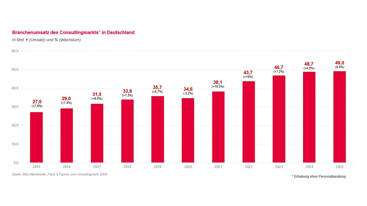 Im Jahr 2025 erreichte die deutsche Unternehmensberatungsbranche einen Gesamtumsatz von 49,0 Milliarden Euro und verzeichnete damit +0,5 Prozent Wachstum. Für 2026 prognostiziert die Branche ein positives Wachstum von +4,5 Prozent, was ein Umsatzwachstum auf 51,1 Mrd. Euro bedeuten würde. Dies sind die zentralen Ergebnisse der Studie "Facts & Figures zum Consultingmarkt 2026", die der Bundesverband Deutscher Unternehmensberatungen BDU e.V. veröffentlicht hat. Die Studie umfasst den deutschen Unternehmensberatungsmarkt ohne Personalberatungen. "Wie tragfähig der Ausblick für 2026 letztlich ist, hängt zum einen stark von den Standortbedingungen in Deutschland und deren Wirkung auf die Kundenbranchen ab und zum anderen von der Fähigkeit der Beratungen, mit dem technologischen Wandel umzugehen.", sagt Iris Grewe, Präsidentin des Bundesverband Deutscher Unternehmensberatungen.