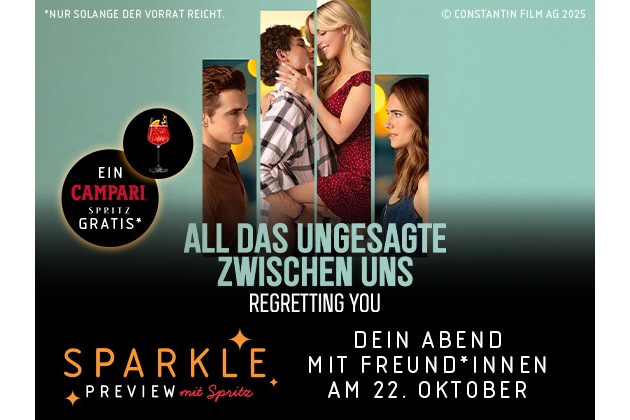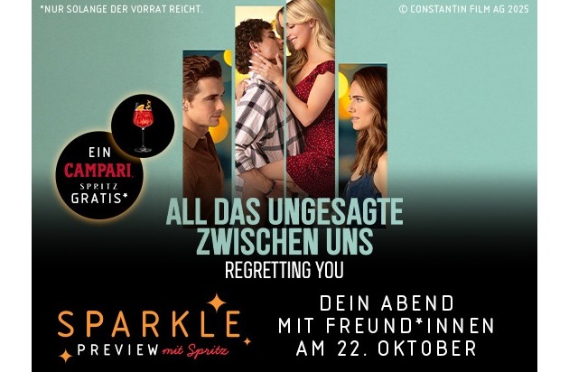 Hamburg, 21. Oktober 2025: Gäst*innen der beliebten SPARKLE PREVIEW dürfen sich freuen. Denn von nun an bietet CinemaxX erstmalig in Zusammenarbeit mit Campari einen stilvollen Aperitif zu allen Filmen des beliebten Formats. Die ergreifende Coming-of-Age-Geschichte ALL DAS UNGESAGTE ZWISCHEN UNS – REGRETTING YOU macht am 22. Oktober den Anfang – und bietet allen Fans deutschlandweit die Gelegenheit, sich selbst vom neuen Angebot zu überzeugen. Was dieses beinhaltet? Wahlweise einen Campari Spritz oder alternativ einen alkoholfreien Crodino Spritz: für bittersüße Momente auf der großen Leinwand.